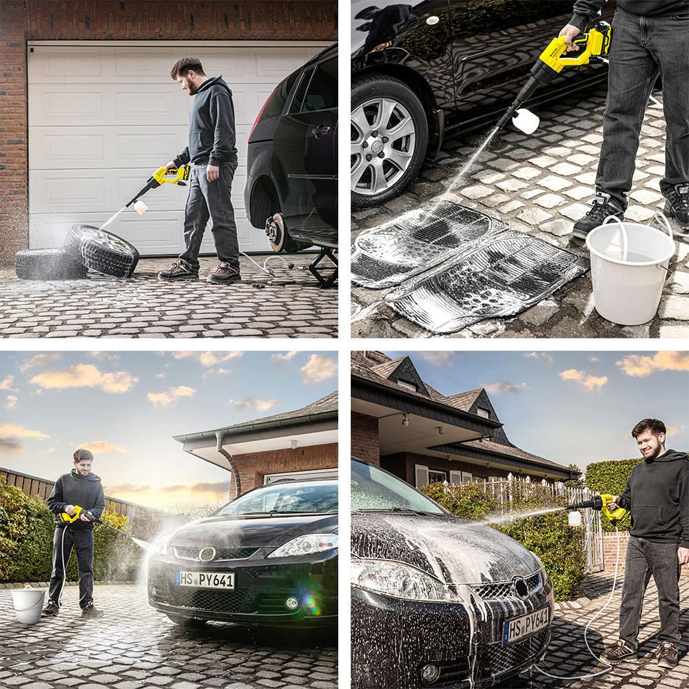 A potente lavadora de alta pressão, com uma pressão de funcionamento de 22 bar, pode obter a água necessária para a limpeza a partir de uma mangueira de jardim ou uma fonte de água alternativa, como, por ex., um balde ou reservatório de águas pluviais. Basta mergulhar a mangueira de sucção fornecida num recipiente com água – e pronto.
