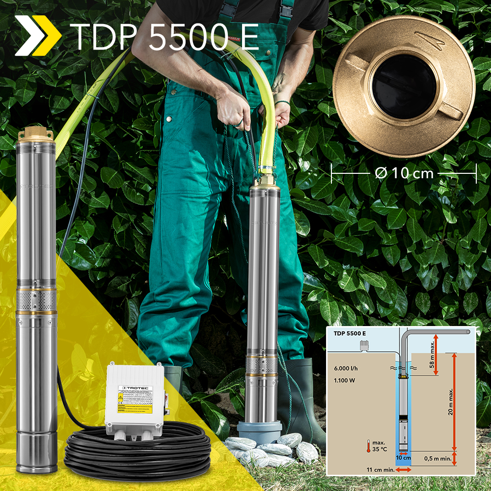 - apresenta os mais modernos mecanismos de proteção: a bomba para poço profundo TDP 5500 E encapsulada é totalmente à prova de pó e água conforme a classe de proteção IP68. Desta forma, a bomba pode permanecer continuadamente no poço, mesmo quando não está a ser usada. A caixa de controlo à prova de salpicos de água permite uma montagem num local exterior protegido da chuva, graças à sua classe de proteção IP44.