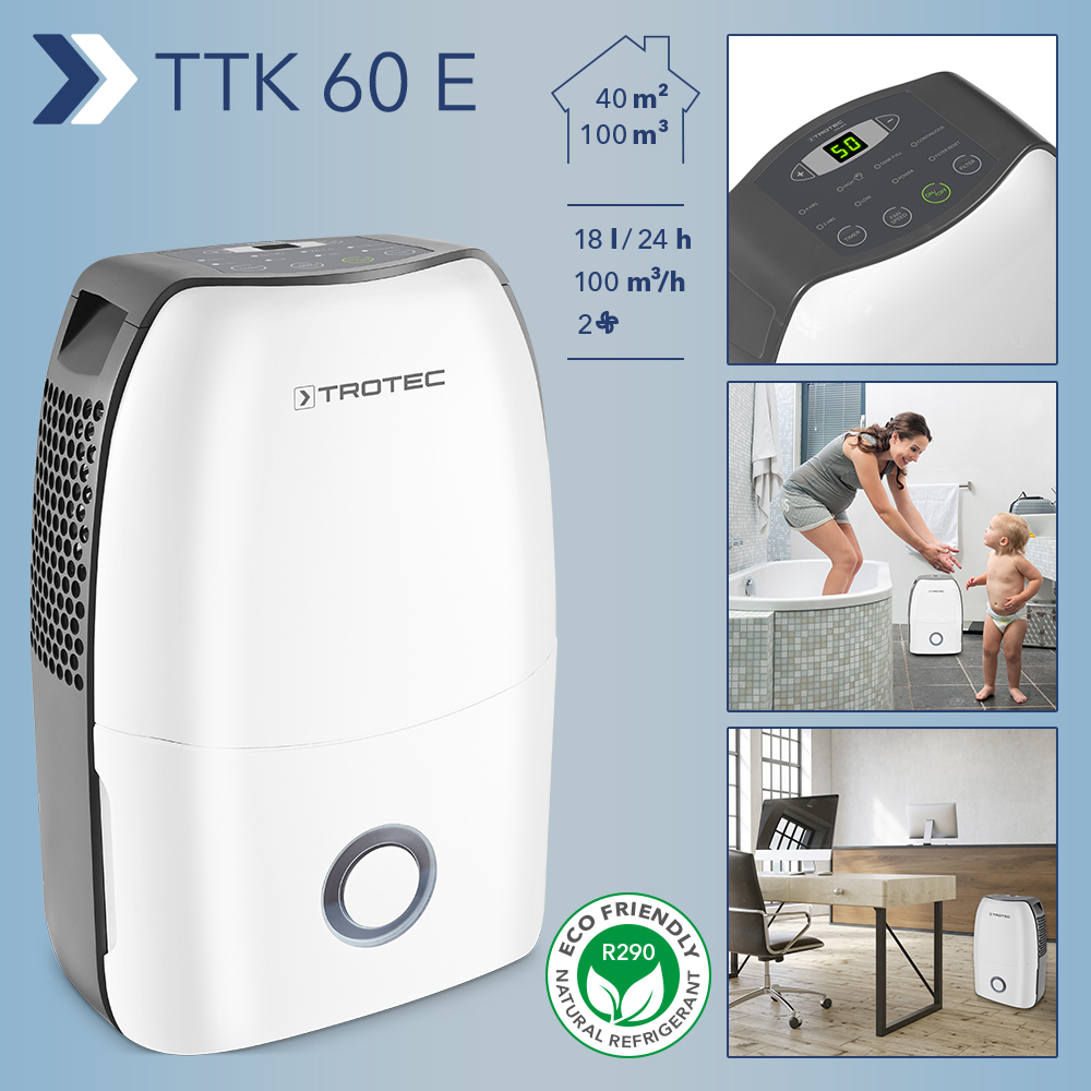 Usufrua da qualidade de marca Trotec como garantia de mais-valia, segurança e funcionalidade. Não hesite e encomende já hoje o desumidificador TTK 60 E ao nosso atual preço de promoção, por apenas 229,95 €, com IVA incl. – agora na loja online da Trotec!