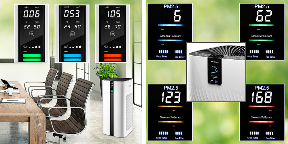 Especialmente conveniente: os purificadores de ar AirgoClean® com indicador de qualidade do ar integrado dão a conhecer a qualidade do ar, de outra forma desconhecida. Para além do indicador numérico do valor PM2.5 (quantidade de partículas finas <2,5 µm), um indicador ótico com luzes LED coloridas indica o grau de pureza do ar ambiente.