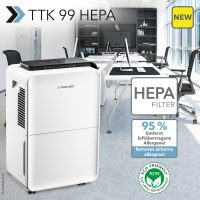 Duas questões atuais: O que posso fazer para remover o ar húmido do outono para fora da minha casa e das salas de escritório, antes que se comece a formar bolor prejudicial à saúde? E, perante o risco das novas ondas de Coronavírus e do vírus da gripe, o que posso fazer nas minhas salas para manter os elementos patogénicos, tais como vírus e bactérias, bem como outras substâncias nocivas em suspensão literalmente longe das minhas vias respiratórias? A solução está no novo TTK 99 HEPA: Ele é o mais potente da sua categoria – e combina duas tecnologias altamente eficientes para a melhoria da qualidade do ar ambiente: A desumidificação e purificação de ar automática, controlada por higróstato, com filtro HEPA.