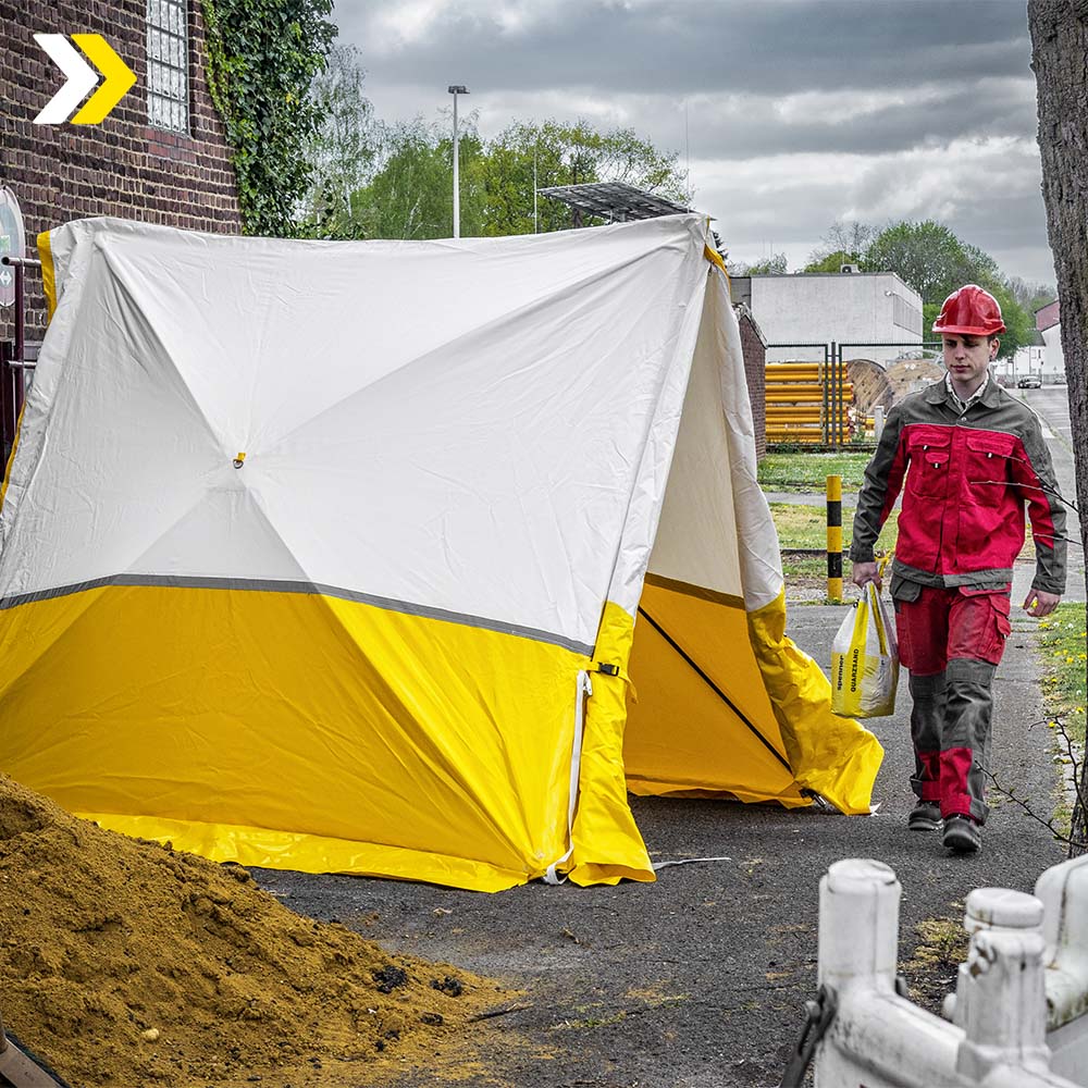 As tendas de trabalho Trotec como a 180 TE são perfeitas em operações muito variadas, como, por exemplo, nos trabalhos em caixas de distribuição e de comando, na montagem de juntas de tubagem, em trabalhos de terraplanagem e de cablagem, na bombagem e inspeção de águas residuais, assim como em trabalhos em esgotos e construção de estradas. Com um comprimento de 180 cm, uma largura de 180 cm e uma altura de 170 cm, estas tendas são a ferramenta ideal para trabalhar confortavelmente ao ar livre – apresentando, além disso, um peso reduzido de apenas aproximadamente 14 kg. O melhor: para trabalhos de montagem e de instalação seguros e com esforço reduzido no interior da tenda, a reação à luz específica do tecido de poliéster é particularmente vantajosa, uma vez que este material praticamente não absorve a luz natural, não alterando, assim, as cores. Esta característica permite reconhecer e distinguir facilmente as diferentes cores das cablagens quando trabalha dentro da tenda.
