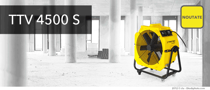 Indiferent dacă doriţi să utilizaţi ventilatorul într-un unghi de 0°, 45° sau 90°, cu suportul nostru de înclinare puteţi poziţiona ventilatorul în mod flexibil, mai ales la ventilarea focusată a zonelor aflate pe tavan sau pe partea superioară a unui perete. Cu o capacitate mare de ventilare de 5.000 m³/h şi o presiune de 130 Pa, ventilatorul axial TTV 4500 S e alegerea profesională pentru uscarea construcţiilor, pentru exhaustarea rapidă a prafului sau ventilarea şi aerisirea depozitelor, şantierelor sau atelierelor.