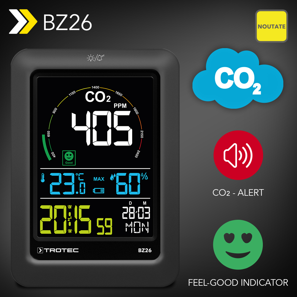 NOU Monitor CO2 pentru calitatea aerului BZ26: cu ajutorul monitorizării calității aerului, raportează în mod fiabil când este timpul să ventilați – în sfârșit disponibil