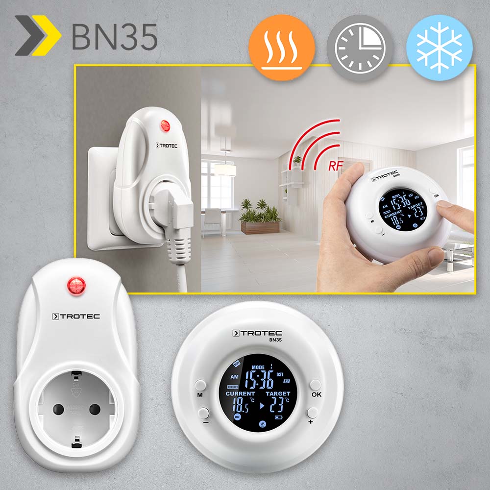 Vremea caldă de primăvară începe să se simtă peste tot. Prin urmare, este foarte convenabil pentru dvs că soluția confortabilă pentru termostat și controlul timpului pentru dispozitivele dvs. electrice de încălzire sau răcire este în sfârșit disponibil. BN35 vă scutește de timp și de alergatul enervant, deoarece în viitor puteți utiliza pur și simplu telecomanda pentru a determina temperatura camerei la care trebuie pornite sau oprite radiatoarele electrice sau sistemele de aer condiționat. Cel mai tare: puteți controla până la 100 de prize wireless, în același timp cu un singur termostat wireless, adică transmițătorul fără a fi nevoie să vă ridicați. Pur și simplu de pe canapea …