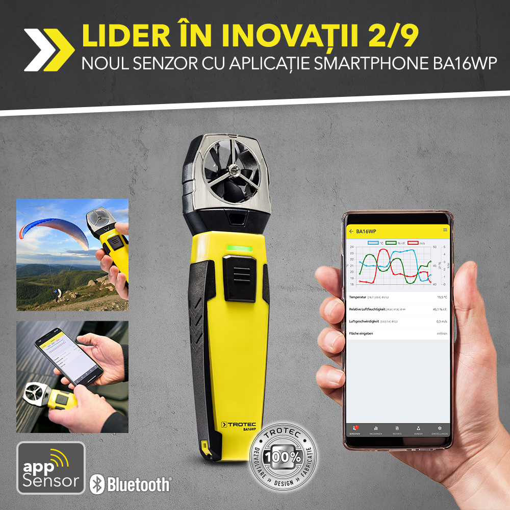 Astăzi vă prezentăm primul nostru senzor cu aplicație smartphone: anemometrul cu pale cu senzor cu aplicație smartphone BA16WP. În combinație cu aplicația mobilă gratuită MultiMeasure Mobile-App și un telefon smartphone este posibil ca aparatul să măsoare și să indice viteza vântului, debitul de aer, temperatura aerului și umiditatea relativă.  Acest lucru este util pentru controlul aparatelor casnice și de climatizare sau aerisire precum și instalațiile de climatizare din camerele de servere. Se poate utiliza chiar și la precizarea direcției vântului la reprezentațiile sportive.