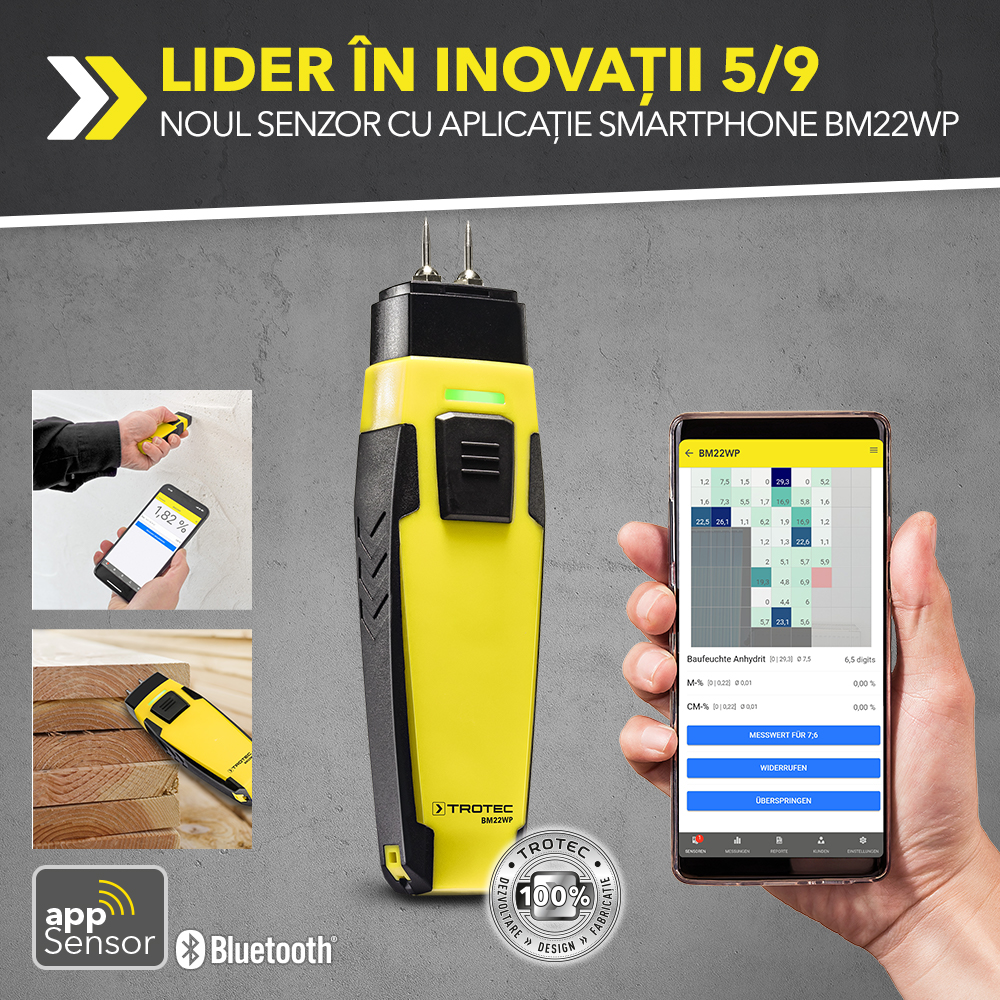 Combinația dintre toate acestea este relevantă: pe de o parte jocul dintre senzorul cu aplicație BM22WP și aplicația gratuită MultiMeasure Mobile care fac posibilă o măsurare a valorilor umidității materialelor după metoda rezistenței, iar pe de altă parte profitați de o multitudine de alte avantaje precum funcțiunea de analizare, controlul și documentarea de date direct pe telefonul smartphone, pentru că aici veți manevra și analiza datele măsurate, economisind energie și loc.