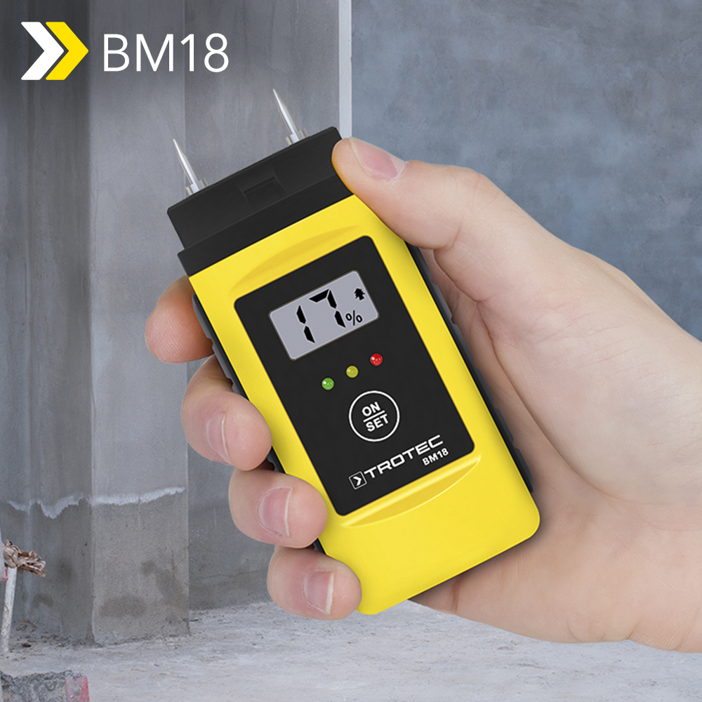 De multe ori trebuie să știi exact câtă umiditate există în lemn și în alte materiale de construcție, de exemplu pentru a evita deteriorarea structurii clădirii, deoarece în zidăria umedă se instalează rapid mucegaiul. Lemnul pentru construcții ar trebui să aibă un anumit nivel de uscăciune înainte ca acesta să poată fi prelucrat. Și, de exemplu, dacă doriți să vă asigurați că lemnul dvs. de foc este suficient de uscat. În toate aceste cazuri, contorul de umiditate BM18 este prima alegere: îl puteți utiliza pentru a măsura lemnul și umiditatea clădirii în câteva secunde – și pentru a efectua toate setările cu un singur buton de control.