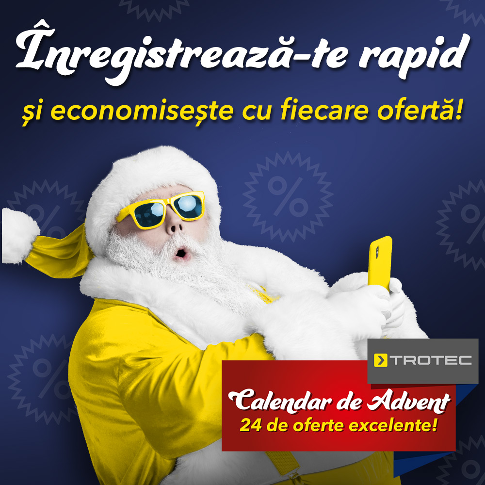 Participați și economisiți! Calendarul de advent de la Trotec începe la 01.12.2022. 24 de oferte excelente vă așteaptă până la 24.12.2022. Înscrieți-vă pur și simplu la newsletter și în fiecare zi veți primi un produs surpriză din gama noastră la un preț special. Merită! Chiar și după aceea, veți fi întotdeauna informat despre cele mai recente oferte cu buletinul informativ Trotec și puteți beneficia de super prețuri de economisire. Așadar, înregistrați-vă direct aici: ro.trotec.com/shop/trotec-newsletter