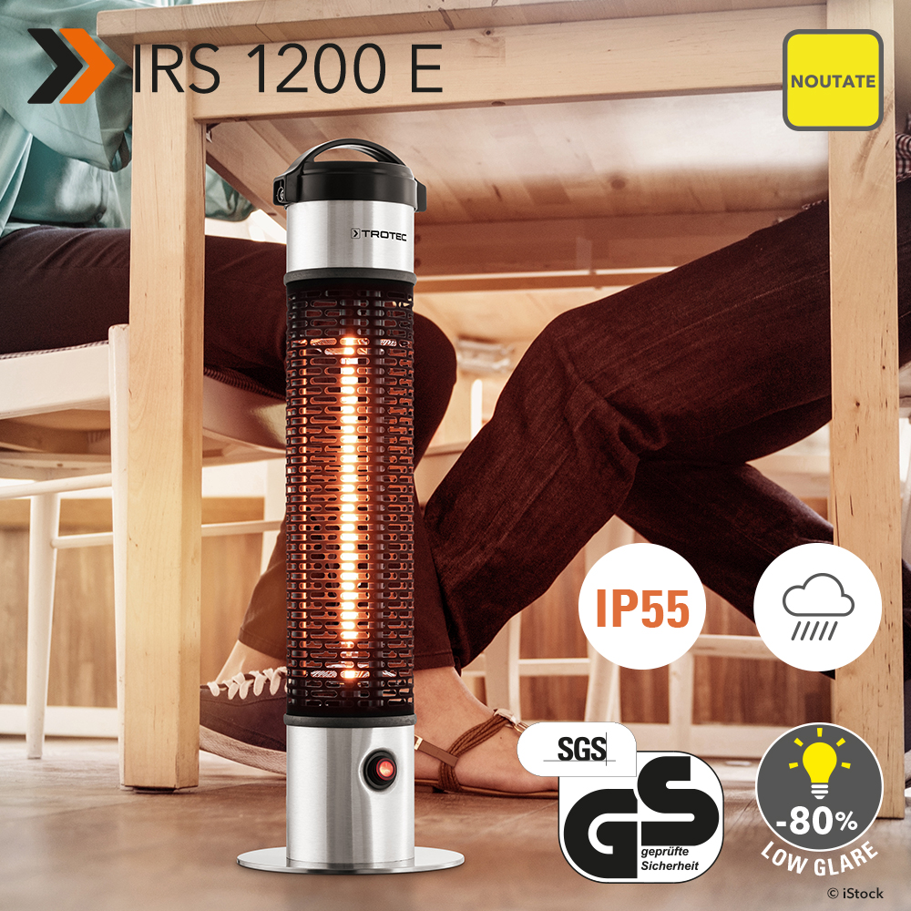 Acum se face ceva mai puțin frig. Terasa și balconul ne cheamă afară aproape în fiecare zi. Dar cel mai târziu când frigul se strecoară încet pe picioarele tale, îți pierzi pofta de a sta acolo mult timp. De aceea, încălzitorul de terasă IRS 1200 E este potrivit pentru perioada de tranziție dintre anotimpuri: încălzitorul compact de 360°, cu ajutorul înălțimii sale avantajoase de doar 65 de centimetri, încălzește cu adevărat sub masă. Poziționat lângă o zonă de relaxare, încălzitorul radiant emite căldura sa plăcută în infraroșu la înălțimea scaunului. Gata cu picioarele reci!