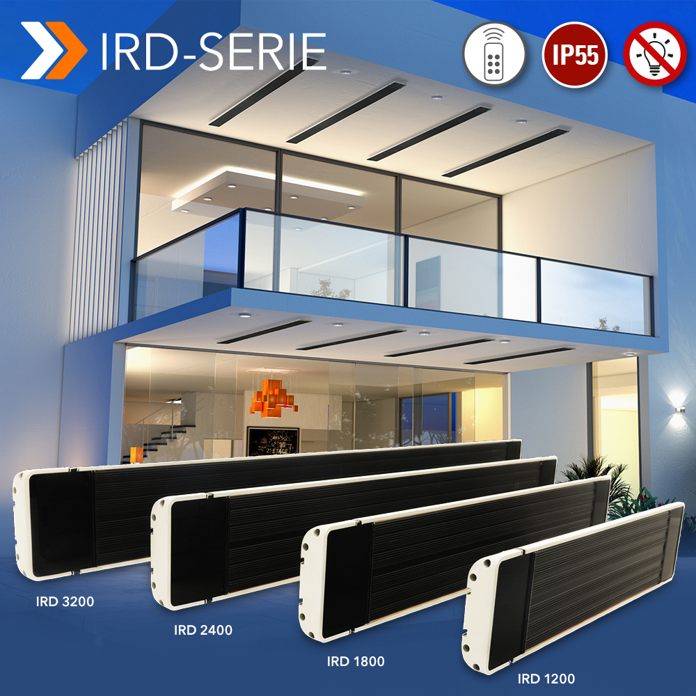 Radiatorul obscur IRD 3200 se află din nou pe stoc exact acum înaintea sărbătorilor de iarnă pentru a putea petrece pe terasă. Radiatorul livrează căldură plăcută cu infraroșu fără să emită lumină. Radiatorul este construit într-o carcasă elegantă din aluminiu și este soluție inovativă de pimă clasă. Se poate utiliza optimal în domeniile exterioare private cât și în gastronomie.