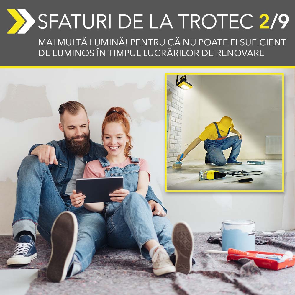 Camere luminoase ca ziua la renovare, încăperi bine luminate la subsol atunci când etanșați lucrările și vizibilitate clară în aer liber, chiar și seara sau noaptea – care meșter ar spune nu la asta? De aceea, noi, cei de la Trotec, am dezvoltat propria noastră gamă de lumini de lucru care vă oferă condiții optime de iluminare prin simpla apăsare a unui buton. Când și unde vrei! Chiar și în timpul renovărilor, în care trebuie să faci fără iluminare instalată permanent, luminile noastre flexibile de lucru vă oferă cea mai bună vedere cu multă lumină.