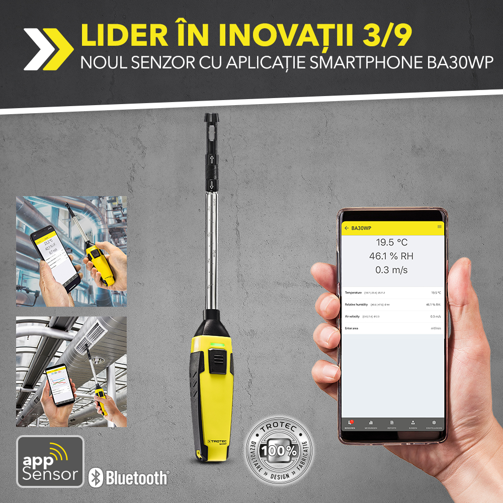 Anemometrul cu fir cald BA30WP cu senzor face posibilă conectarea cu softul MultiMeasure Mobile-App și măsoară cu precizie viteza curenților de aer, debitul, temperatura din aer și umiditatea relativă. Toate valorile detectate le puteți citi confortabil pe ecranul telefonului smartphone. Aparatul este utilizat cu precădere pentru controlul performanțelor aparatelor de aerisire și de climatizare și mai departe până la sistemele de aerisire și răcire din camerele de servere sau alte unități de prelucrări de date. Prin flexibilitatea sa la utilizare, aparatul de măsură se potrivește perfect pentru măsurarea curenților de aer și în locurile greu accesibile.
