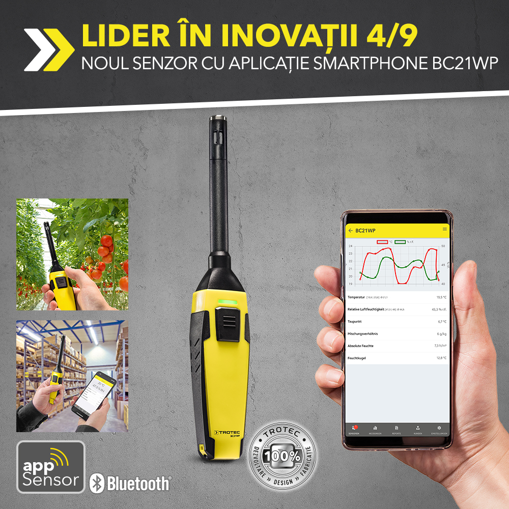 Combinația inteligentă a senzorului cu aplicație smartphone BC21WP cu aplicația gratuită MultiMeasure Mobile face posibilă determinarea parametrilor relevanți precum temperatura și umiditatea din aer în timp real. Aparatura cu senzor de mare calitate și multitudinea de funcțiuni de măsurare fac din acest termohigrometru un aparat de măsurare ideal pentru factorii de climă în mediul casnic sau în ateliere. Mânuirea și valorificarea datelor măsurate se fac direct pe telefonul smartphone propriu.