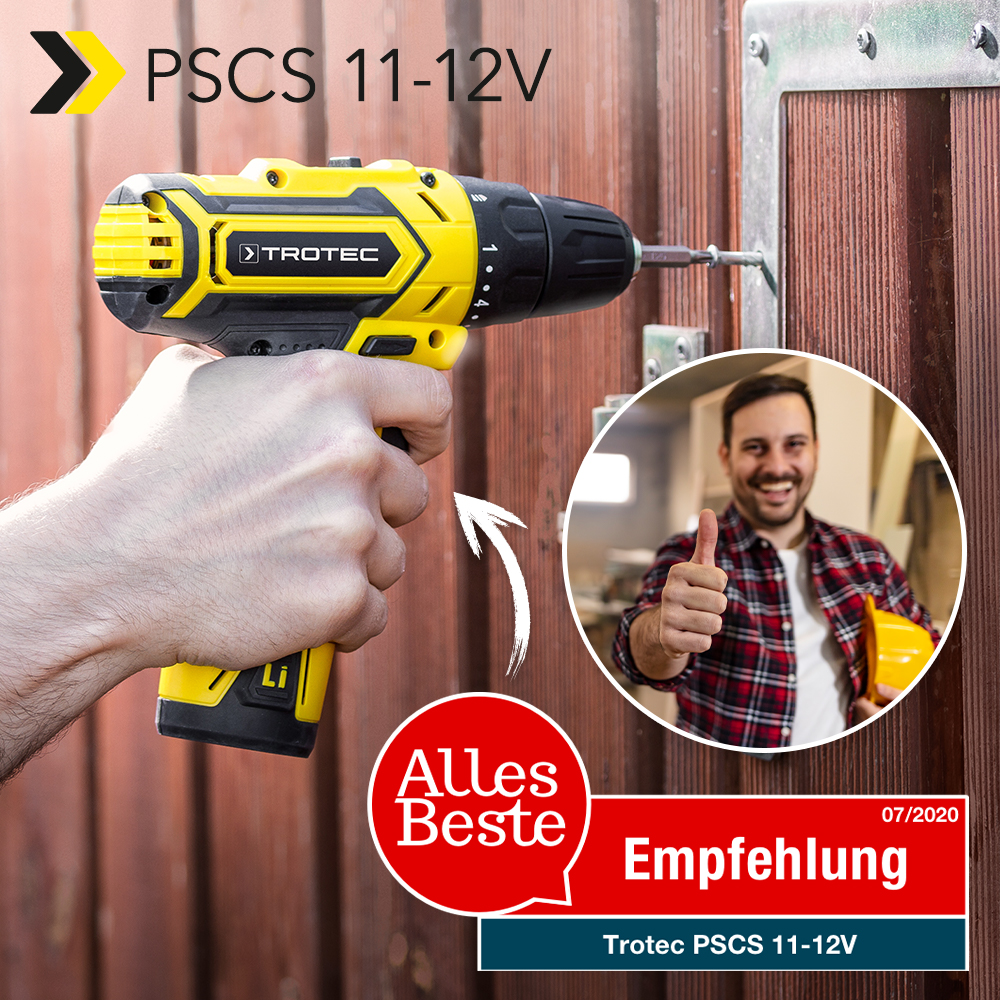 Juriul independent al  ‚Alles Beste‘ acordă mașinii de găurit cu acumulator PSCS 11-12V de la Trotec, dintre cele 12 mașini testate cu alimentare de 12 Volt, un merituos loc trei. Extraordinar: în comparație cu cele două unelte de prim rang de la Metabo și Bosch, șurubelnița cu acumulator de la Trotec costă doar o parte din sumele solicitate aici – diferența de preț ajungând cu până la 75 %. Pe scurt, recomandarea jurnaliștilor specialiști este prin urmare, „Bun și ieftin”: Trotec PSCS 11-12V ”.