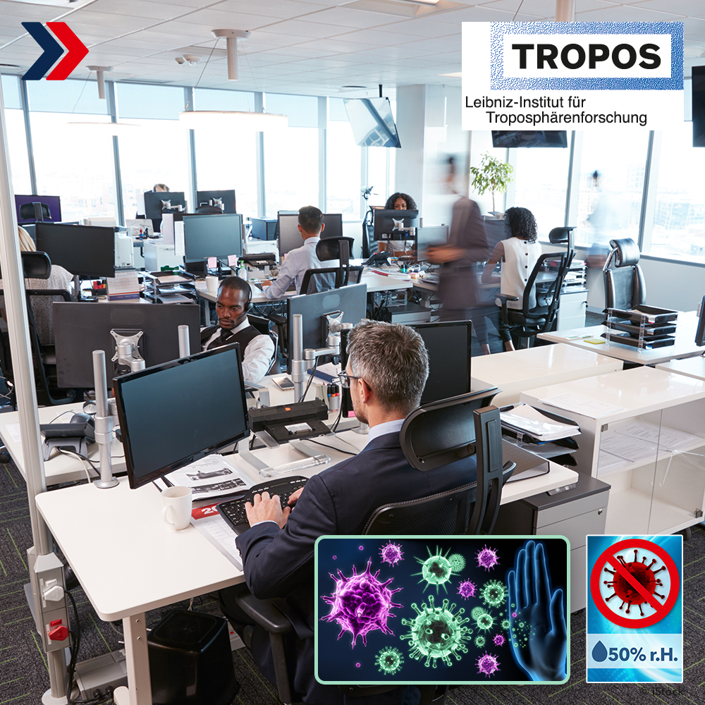 Reversul, totuși, indică în direcția corectă: aerul de birou bine umidificat între 40 – 60% reduce riscul de infecție cu particulele infecțioase de aerosoli corona. Cu cât se acumulează mai multă umiditate din aerul ambiant în aerosolii expirați, cu atât aceștia devin mai grei și cu atât timpul lor în aerul camerei este mai scurt. Aceștia cad la pământ mai devreme și, prin urmare, sunt mai puțin probabil să fie inhalați de oameni sănătoși. Acesta este rezultatul studiilor de la Institutul Leibniz pentru Cercetări Troposferice (TROPOS) din Leipzig.