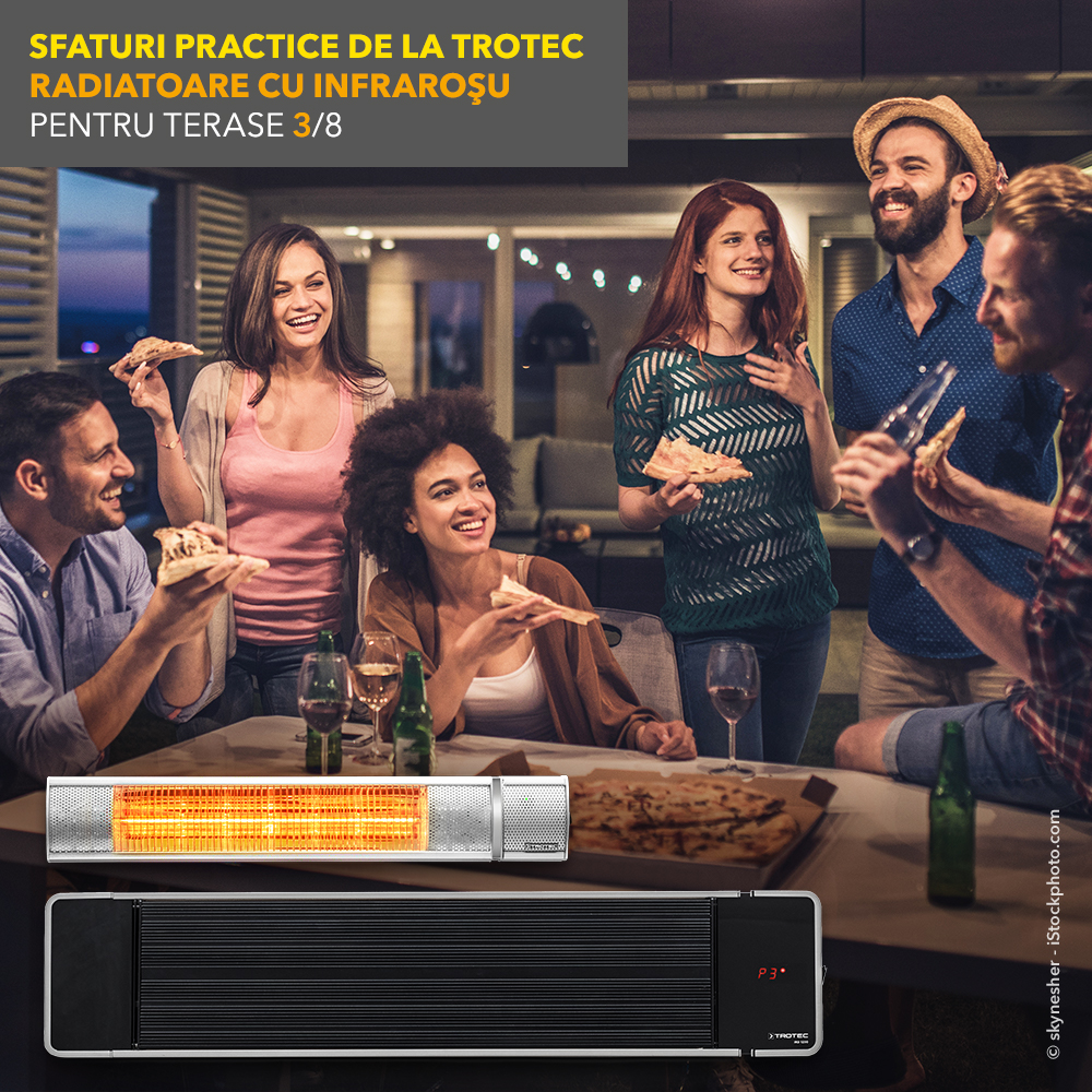 În episodul patru din seria noastră de sfaturi de la Trotec ‚Radiatoarele cu infraroșu pentru terase‘ vă prezentăm două variante de radiatoare moderne. Pe de o parte există radiatoare care nu necesită mult loc pentru amplasare și acestea se montează fie pe perete sau tavan, dar odată montate acestea deservesc un domeniu fix pentru încălzire. Pe cealaltă parte puteți să vă orientați spre un radiator mobil cu poziționare verticală pe care puteți cu ușurință să-l mișcați de la o locație la alta și care necesită o anumită suprafață pentru a putea fi amplasat.