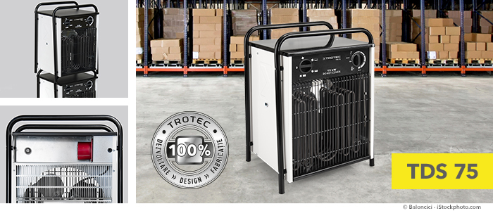 Ca o aerotermă puternică pentru încăperi de un volum mare TDS 75 face o figură foarte bună. Aeroterma de la Trotec este acum livrabilă exclusiv!