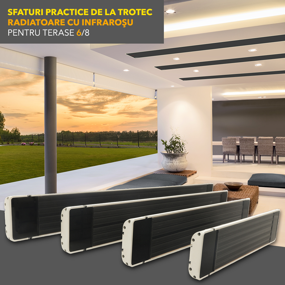 Radiatoarele cu infraroșu sunt acum la modă, ele producând căldură curată, sunt economice, necesită o întreținere mică și – fiind de la Trotec – sunt deosebit de accesibile la preț. Pentru necesități diferite, există și aparate diferite: doriți să savurați căldura afară pe terasă? Doriți să temperați la interior colțurile răcoroase ale camerei de baie? Există soluții dacă lumina cu infraoșu deranjează? Răspunsuri la aceste întrebări le veți găsi în seria noastră de cinci episoade ‚Cunoștințe practice despre radiatoarele cu infraroșu‘.