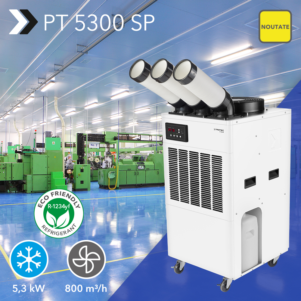 În multe companii comerciale și industriale, temperaturile ambientale ridicate fac parte din procesul de producție și fabricație. Dar, pe termen lung, stresul termic permanent afectează atât starea de bine a angajaților dumneavoastră, cât și funcționarea fără probleme a sistemelor mecanice. Prin urmare, în timp util înainte ca căldura verii să agraveze din nou aceste probleme, vă prezentăm soluția fără greșeală pentru o atmosferă de lucru mai rece – Spotcooler PT 5300 SP cu o capacitate de răcire de 5,3 kW, care este disponibil din nou. Acest lucru vă permite să răciți 3 zone de lucru în același timp. Citiți cât de ușor este!