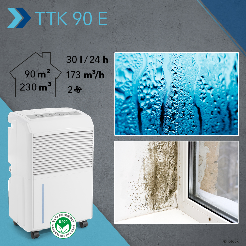 Cu ferestre care se închid ermetic, de exemplu pe motivul renovărilor din punct de vedere energetic, nu mai intră nici un strop de aer; aerul proaspăt intră doar când ferestrele sunt deschise larg. Cu toate acestea, pe vreme umedă închisă, multă umiditate a aerului pătrunde în spațiul de locuit din exterior, sporită suplimentar de utilizarea zilnică a apei calde în bucătărie și baie. Rezultatul este adesea aerul interior nesănătos, inclusiv formarea mucegaiului. Cu dezumidificatorul de confort TTK 67 E, care este acum în sfârșit din nou disponibil, puteți opri eficient acest efect dăunător – și puteți trece iarna mai sănătos!
