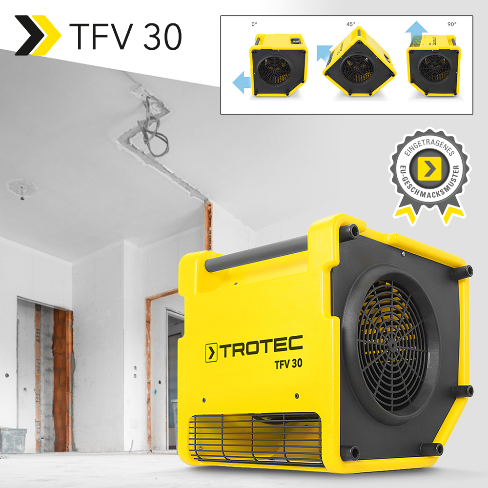 Soluțiile profesionale de uscare sunt necesare mai mult decât în ​​ventilarea cavității, accelerarea uscării în restaurarea daunelor cauzate de apă sau în suportul de uscare a clădirii. Și aici este exact locul în care ventilatorul turbo TFV 30, care este acum în sfârșit disponibil exclusiv de la Trotec, punctează prin caracteristicile sale: canalul său de evacuare a aerului cu formă specială, ventilatorul radial puternic și economisitor de energie și optimizat constant pentru practică. Aflați mai multe despre această soluție optimă pentru utilizarea zilnică continuă în aplicații profesionale, comerciale.