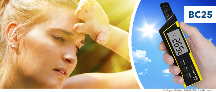 BC25 este un instrument de măsură deosebit de eficace și poate determina eficient orice surplus ce poate apărea în corp prin temperaturi ridicate în combinație cu umiditatea relativă ridicată. Cu ajutorul funcțiunilor de alarmare „Index de căldură” și „Temperatura resimțită” se pot preveni din start daunele provenite de caniculă și se pot trasa granițele între care corpul uman se poate încă acomoda în cazul temperaturilor înalte ale verii. Astfel, instumentul de măsură BC25 se potrivește excelent ca instrument de atenționare pentru oamenii mai în vârstă sau pentru cei care suferă de diferite afecțiuni, astfel încât în zilele de caniculă aceștia sa nu se expună suprasolicitărilor.