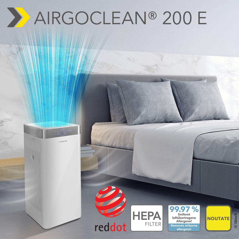 Cu designul său frumos atemporal, care a câștigat premiul Red Dot Design, purificatorul de aer AirgoClean® 200 E trimite un semnal clar împotriva oricărei forme de poluare a aerului din interior. Acest lucru se datorează faptului că aerul din interior este în general mult mai poluat decât aerul exterior. Cu alergeni patogeni, bacterii, viruși, praf fin și mucegai. În toate aceste cazuri, puteți îmbunătăți calitatea aerului cu AirgoClean® 200 E și vă puteți proteja pe dumneavoastră și pe cei din jur de boli. Datorită aerului curat filtrat cu HEPA, care este 99,97% lipsit de particule patogene din aer și poluanți. Un must-have special pentru cei care suferă de alergii! Și, de asemenea, bine: sunt incluse 2 filtre de schimb HEPA cu carbon gratuite!