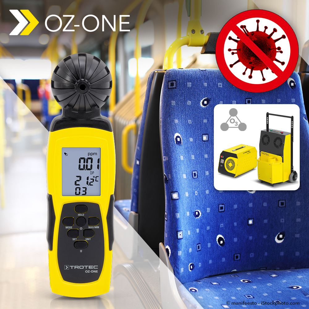 După utilizarea generatoarelor cu ozon precum Airozon 5000 și Airozon Supercracker de la Trotec, este necesar să avem în contininuare grijă la virusul Corona. Ozu=onul este foarte nociv contra virușilor chiar și în concentrații mici. După o dezinfectare cu ozon în autobuze, avioane, trenuri și încăperi, trebuie stabilit dacă gazul s-a evacuat în totalitate din aer. Cu ozonmetrul OZ-ONE aveți posibilitatea de a verifica acest lucru și a stabili rapid concentrația de ozon rămasă în aer.