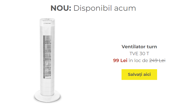 Toate „TOP DEALS” sunt afișate pe pagina noastră de start în magazinul online https://ro.trotec.com/shop/. Pur și simplu navigați cu săgețile spre „dreapta” și „stânga” și veți găsi toate ofertele curente.