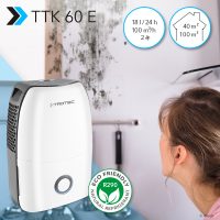 Se recomandă utilizarea în timp util și permanent a unui dezumidificator cum ar fi TTK 60 E, astfel încât mucegaiul enervant și care pune în pericol sănătatea să nu se poată dezvolta nici măcar în subsoluri predispuse la umiditate, în camerele de hobby sau pe colțurile și pereții reci. Datorită capacității sale de dezumidificare de maximum 18 litri pe zi, oferă o protecție fiabilă împotriva umezelii și a mucegaiului și este ideal pentru a menține camerele de locuit și de birou sau beciurile încălzite uscate. În plus, dezumidificatorul elegant de confort impresionează prin panoul de control special conceput, care este foarte ușor de utilizat în ciuda multitudinii de funcțiunii.