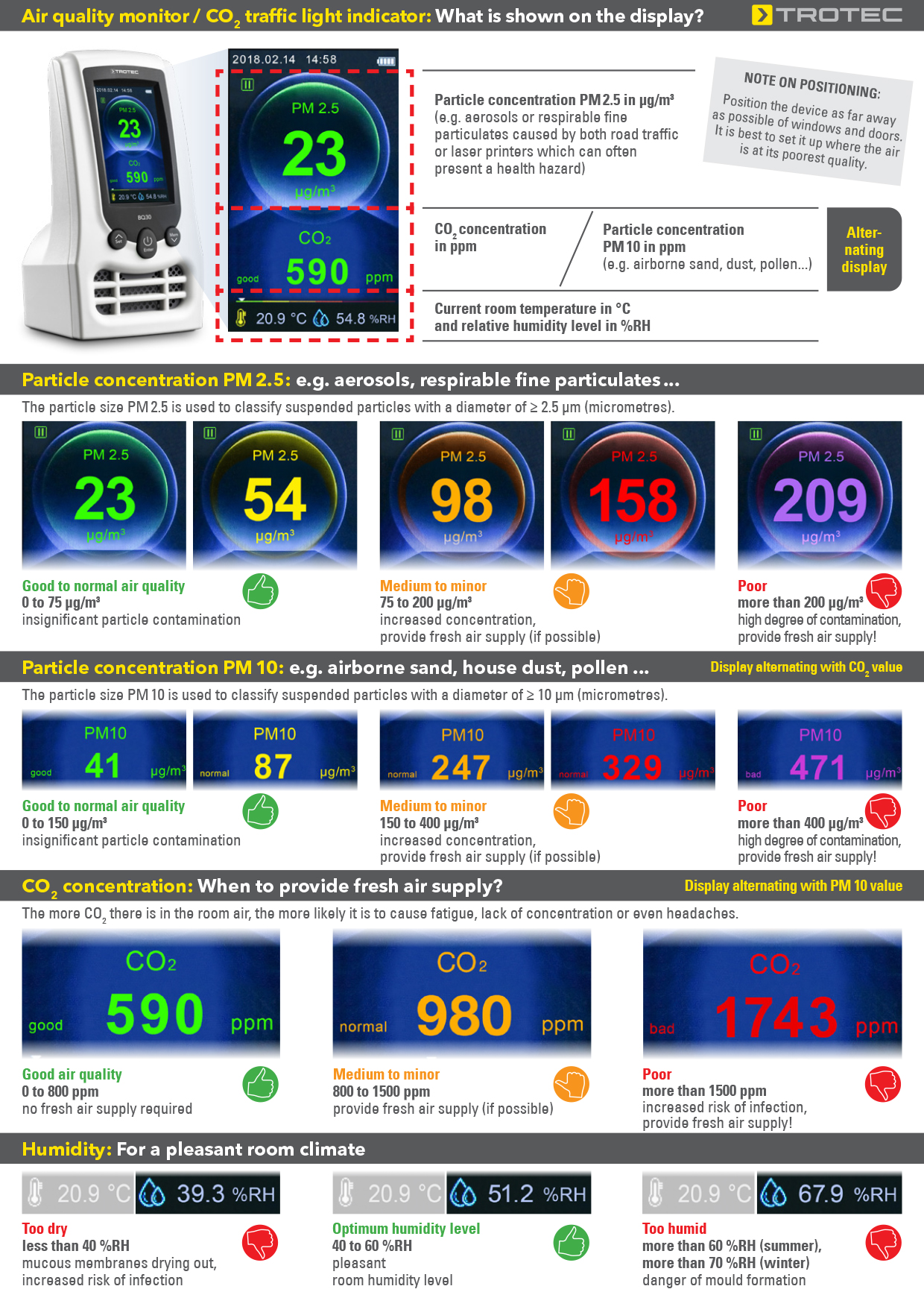 Sursele potențiale de praf fin și emisii de CO₂ au un impact negativ asupra mediului de viață și a stării de bine. Aparent, lucrurile „normale” contribuie la acest lucru, cum ar fi gătitul, aspirarea, fumul de tutun și lumânări sau aprinderea sobelor sau șemineelor. Deoarece o concentrație crescută de praf fin și CO₂ în aerul din cameră este responsabilă pentru tulburări de concentrare, de somn și reacțiile alergice. În pandemia actuală, astfel de dispozitive sub formă de așa-numite semafoare CO₂ ajută pentru a minimiza riscul de infecție printr-o ventilație și aerisire adecvată. Monitorul de calitate a aerului Trotec BQ30 măsoară nu numai poluarea cu CO₂ actuală, ci și poluarea cu praf fin și polen, precum și datele climatice predominante în interior – și arată dintr-o privire cum este calitatea aerului în încăpere.