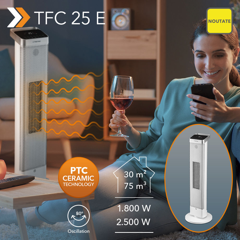 Aeroterma ceramică TFC 25 E încălzește deosebit de confortabil și eficient din punct de vedere energetic în modul ECO de economisire a energiei. Elementul de încălzire controlat de termostat ajustează apoi în mod optim puterea de încălzire la temperatura ambientală actuală, astfel încât să fie eliberată în încăpere doar atâta căldură cât este necesar, consumând cât mai puțină energie. Sau puteți utiliza controlul termostatului încorporat, cu care puteți utiliza două niveluri de încălzire (1.800 W/2.500 W) și un control precis al temperaturii pentru a vă încălzi individual spațiul de locuit sau de birou până la 30 m² sau 75 m³ cu un debit constant de aerul cald în intervalul de temperatură de la 5 °C la 35 °C se poate încălzi. De îndată ce temperatura prestabilită este atinsă, încălzitorul cu ventilator se oprește pentru a economisi energie până când trebuie reîncălzit.