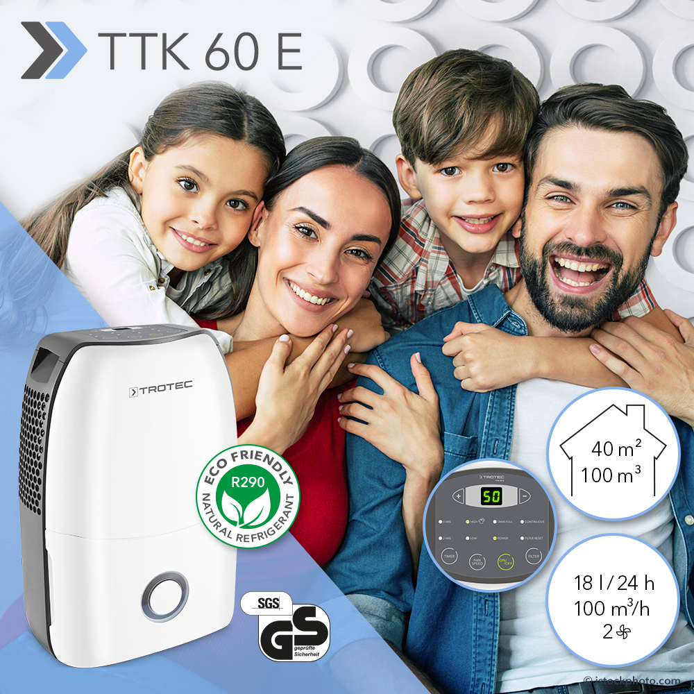 Acesta se arată util în primul rând în bucătărie și baie. Primele indicii că umiditatea este ridicată sunt picăturile de apă de pe faianță și gresie. Nu așteptați pănă când apar primii pori de mucegai. Aveți încredere în dezumidificatorul confort de aer TTK 60 E: prin performanța de dezumidificare de maxim 18 litri pe zi, acesta conferă siguranță împotriva umezelii și formării de mucegai. Prin combinarea de suflantă în două trepte, un domeniu larg de lucru, comanda prin higrostat și compresorul puternic de 0,47 kW, dezumidificatorul este capabil să mențină uscat aerul din încăperile de locuit și birouri sau beciuri neîncălzite.