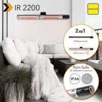 Radiatorul IR 2200 este la fel de flexibil în utilizare cât și la amplasare și fixare. Un sistem de cablu decorativ cu o conexiune rapidă cu șuruburi este deja inclus în pachetul de livrare pentru montarea simplă pe tavan. Un suport de perete, care este de asemenea furnizat, permite fixarea încălzitorului pe perete orizontal sau vertical. Datorită îmbinării pivotante la 45 ° a montajului pe perete sau pe tavan, radiația de căldură pot fi îndreptată cu precizie către zonele cu scaune sau mese.
