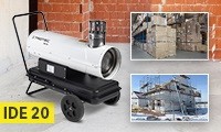 Acest tun de căldură IDE 20 produce cu cei 20 kW ai săi o cantitate curată şi uscată de aer fierbinte, de până la 600 m³/h. Alimentarea cu combustibil are loc variabil, cu Diesel sau ulei de încălzire. Combustibilul lichid va fi alimentat constant cu ajutorul unei pompe valoroase. Cantitatea existentă în rezervor poate fi citită comod pe afişajul integrat. Filtrul de combustibil e uşor de accesat. Datorită carcasei rezistente, dublu lăcuite, aeroterma face faţă şi unei utilizări mai îndelungate în exterior. Carcasa e montată pe un suport pe roţi, cu rezervor de combustibil integrat şi cu un suport pentru cablu.