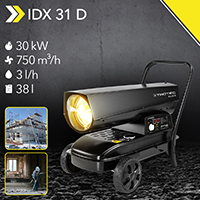 Cu aeroterma cu combustibil lichid cu ardere directă IDX 31 D încălziți efectiv și economic fie în ateliere, în grajduri, în depozite bine aerisite sau domenii acoperite exterioare. Nicio altă sursă de încălzire nu livrează căldură directă în încăperi deschise mai eficient și la un buget mai mic. Cu un consum maxim de numai 3 litri pe oră, aeroterma de putere de 30 kW produce un debit de aer fierbinte de până la 750 m³/h.  Programarea temperaturii se face pe un termostat cu indicator real digital și este deosebit de simplă.
