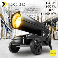 Cu ajutorul celor 55 kW, aeroterma IDX 50 D generează o cantitate de aer cald de până la 1.1000 m³ / h – cu un consum maxim de 4,8 litri de combustibil lichid pe oră. Preselecția simplă a temperaturii (în intervalul 5 – 45 ° C) are loc la aeroterma cu încălzire directă printr-un termostat reglabil continuu și afișaj dual al valorii reale. Când se atinge temperatura dorită, dispozitivul se oprește complet automat și când aceasta sub valoarea dorită se aprinde din nou automat. Un al doilea afișaj digital oferă informații despre temperatura curentă a camerei. Presiunea aerului poate fi citită pe manometrul de pe spate în timpul funcționării. Presiunea aerului poate fi modificată și cu un șurub.