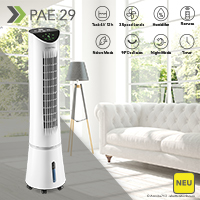 Cu noul Design-Aircooler PAE 29 suflați aerul fierbinte din încăpere adunat pe timpul verii și aduceți un aer plăcut prin răcirea naturală cu evaporare la rece, după principiul filtrului umed. În plus, puteți utiliza răcitorul 3-în-1 cu ajutorul celor trei trepte de suflare, ca ventilator turn. În lunile mai reci ale anului, PAE 29 lucrează ca umidificator eficient și conferă astfel o climatizare plăcută în încăpere. Aerul mult prea uscat din perioada de încălzire cu caloriferul este umidificat optimal iar mucoasele din nas, gât și gură nu se mai irită. La o umiditate de 50 % se reduce considerabil pericolul infectării cu viruși și bacterii din aer.