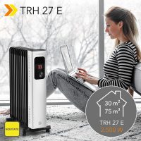 Noul radiator pe ulei TRH 27 E combină tehnologia modernă cu funcționarea necomplicată: Fie că este vorba de o cameră de recreere, mansardă, pivniță, atelier, garaj sau casă de vacanță – radiatorul cu 11 elemenți, care este alimentat de electricitate de la priză, emite puterea termică maximă de 2.500 de wați, care poate fi apelată în 3 trepte de încălzire după doar 8 minute de încălzire, aducând temperaturi calde plăcute în încăperi de până la 30 m² respectiv 75 m³. Designul inovator al elemenților de încălzire cu circuite de încălzire diferite și proiectate cu precizie permite o distribuție mai uniformă și mai eficientă a căldurii în comparație cu radiatoarele convenționale.