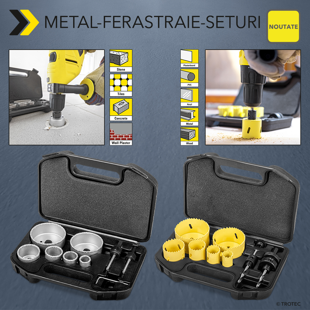 Profitați de calitatea de marcă de la Trotec, ca un garant al valorii înalte, siguranței și funcționalității. Comandați cel mai bine în magazinul nostru online la cele mai atractive prețuri seturile de burghie coroană de calitate: