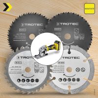 Cu noile seturi de discuri de ferăstrău circular Trotec într-un pachet practic de depozitare, aveți întotdeauna discul de ferăstrău perfect pentru aproape orice material și fiecare cerință. Și nu numai pentru mini-ferăstrăul circular compact fără cablu PCSS 05-20V de la Trotec, ci și pentru toate mini-ferăstraie standard cu tăiere în plonjă. Indiferent dacă este în gospodărie sau în sectorul hobby și profesional: există multe oportunități de a folosi un mini ferăstrău circular – dar nu fiecare disc de ferăstrău circular tăie toate materialele la fel de bine.