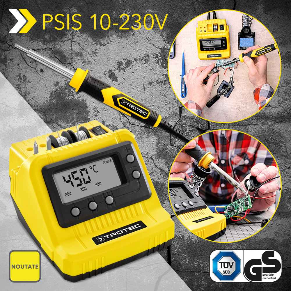 Stația de lipit digitală PSIS 10-230V permite pasionaților de echipamente electronice și hobby-uri de bricolaj, lipirea profesională controlată de temperatură a componentelor electronice. Stația de lipit de 60 de wați impresionează prin tehnologia sa de încălzire la fel de puternică și inteligentă, rezultat într-un timp scurt de încălzire de 60 de secunde și vă oferă o temperatură de lucru rapidă și constantă în intervalul de temperatură cuprins între 200 și 450 ° C. Puteți selecta în mod convenabil trei niveluri de temperatură la apăsarea unui buton și să le reglați în trepte de 10 ° C. În faza de încălzire sau în timpul pauzelor de lipit, fierul de lipit cu formă ergonomică găsește un loc sigur în spirala de susținere a suportului de lipit din plastic rezistent la căldură.