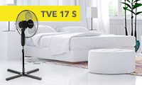 Datorită faptului că ventilatorul se poate fixa vertical fără trepte între 105 și 122 cm, se poate utiliza aproape în orice loc. Ventilatorul TVE 17 S ne convinge datorită combinației reușite dintre un picior robust și stabil și paletele calibrate ale capuli ventilator. Prin această combinație ventilatorul funcționează deosebit de silențios. Aceasta face ca ventilatorul să poată fi utilizat fără probleme și în camerele de dormit. Bineînteles că ventilatorul întrunește toate normele de siguranță. El este protejat împotriva supraîncălzirii iar paletele ventilatorului sunt înconjurate de un grilaj metalic de protecție ușor de intreținut și de demontat. Piciorul robus sub formă de stea al TVE 17 S conferă stabilitate.