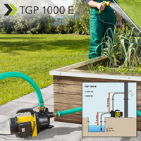 Cine dorește să irige o grădină mare cu suprafețe de gazon, cu straturi de flori, tufe și copaci dar în același timp să reducă efortul pentru astfel de lucrări, este bine să aibe în vedere pompa de grădină  TGP 1000 E care este acum din nou livrabilă. Pompa extrage apa dintr-o sursă de apă adâncă și o poate transporta până la 7 metri înălțime. Prin puterea de 1.000 de wați se pot pompa până la 3.300 litri de apă menajeră pe oră.