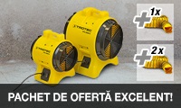 Noi vă oferim diverse pachete de reducere, în combinație cu furtunele de transport aer. În funcție de pachetul ales, puteți economisi până la aproape 50%: noi vă oferim ambele modele la ofertă, în combinație cu un furtun și cu două furtune de transport aer. Dacă nu aveți nevoie de furtune, puteți desigur utiliza aceste ventilatoare și fără furtune, și să profitați de reducerea acordată pentru aceste două modele.