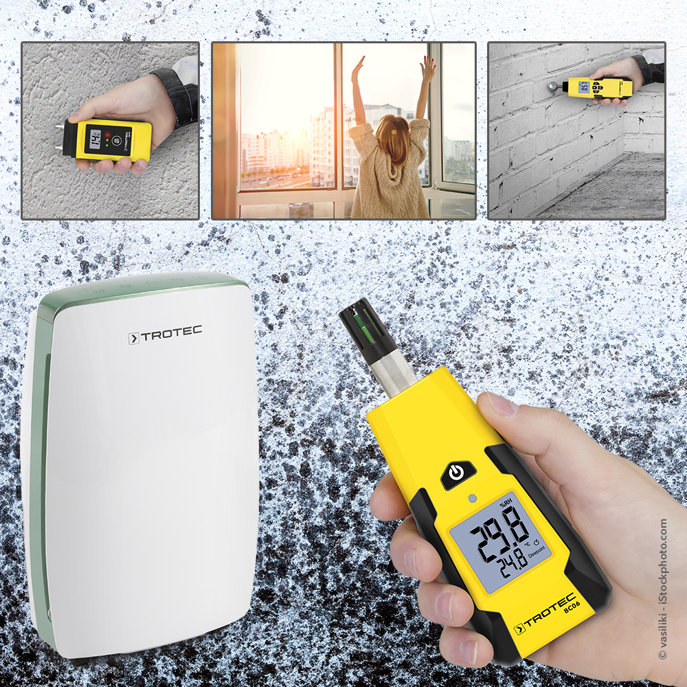 • Ca să puteți identifica rapid zonele cu umiditate crescută din apartament, e bine să contorizați umiditatea cu ajutorul higrometrelor. Cu ajutorul aparatelor de măsură ale climei precum BC06,  BZ15 M sau BZ20M de la Trotec aceste lucrui sunt o treabă simplă.