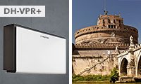 La baza inovațiilor noastre ThinC! în castelul Sant’Angelo sunt dezumidificatoarele din seria DH VPR+ din programul nostru HighPerformance. Acest program este dedicat unei protecții deosebite contra umidității și se utilizează cu succes în încăperi neîncălzite la temperaturi joase în jurul valorii de 0 °C. Completată cu un sistem efectiv de curățare a aerului și module de filtre de aer după normele industriale , oferim aici o soluție deosebită, unică în lume: management activ de climatizare cu funcțiuni de protecție 4-în-1 contra umidității, mirosului, agenților corozivi din aer și prafului. Comandat automat prin higrostat și comutator de intensitate, aerul din încăperea rămâne curat fără praf sau impurități sub aspect igienic și cu o eficiență a economiei de energie constantă.