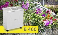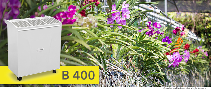Toate aceste sarcini sunt specifice umidificatorului de aer B 400. B 400 este alegerea perfectă pentru serele în care cresc plante exotice, având în vedere capacitatea mare de umidificare pe zi de 60 litri, fiind recomandat pentru încăperi de până la 900 m³. Dvs. reglaţi la panoul de deservire valoarea de umiditate dorită, iar comanda cu higrostat reglează automat clima, astfel ca plantele exotice să poată creşte corespunzător. Pe lângă capacitatea de umidificare, B 400 are şi o dotare de purificator de aer, îmbunătăţind calitatea aerului.