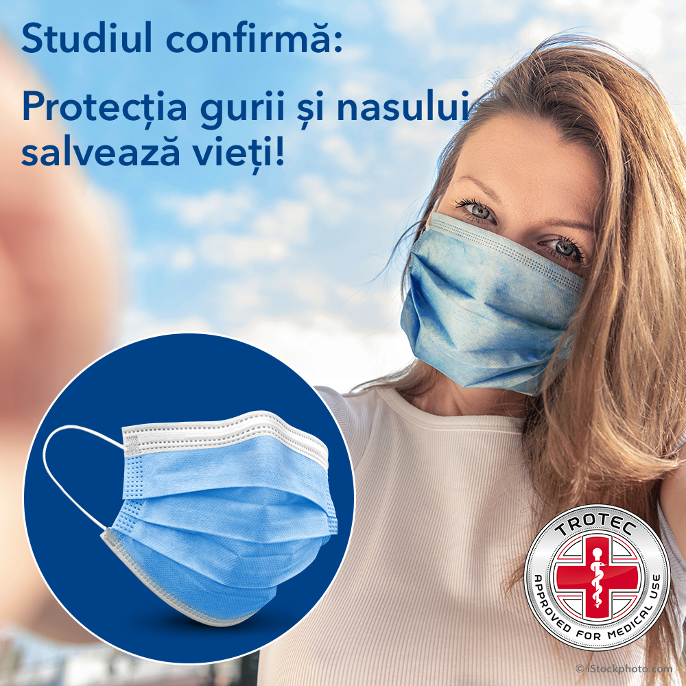 - mască medicinală (Medical Surgical Mask) după protocolul de testatre a unui laborator european acreditat în ramele pandemiei Corona